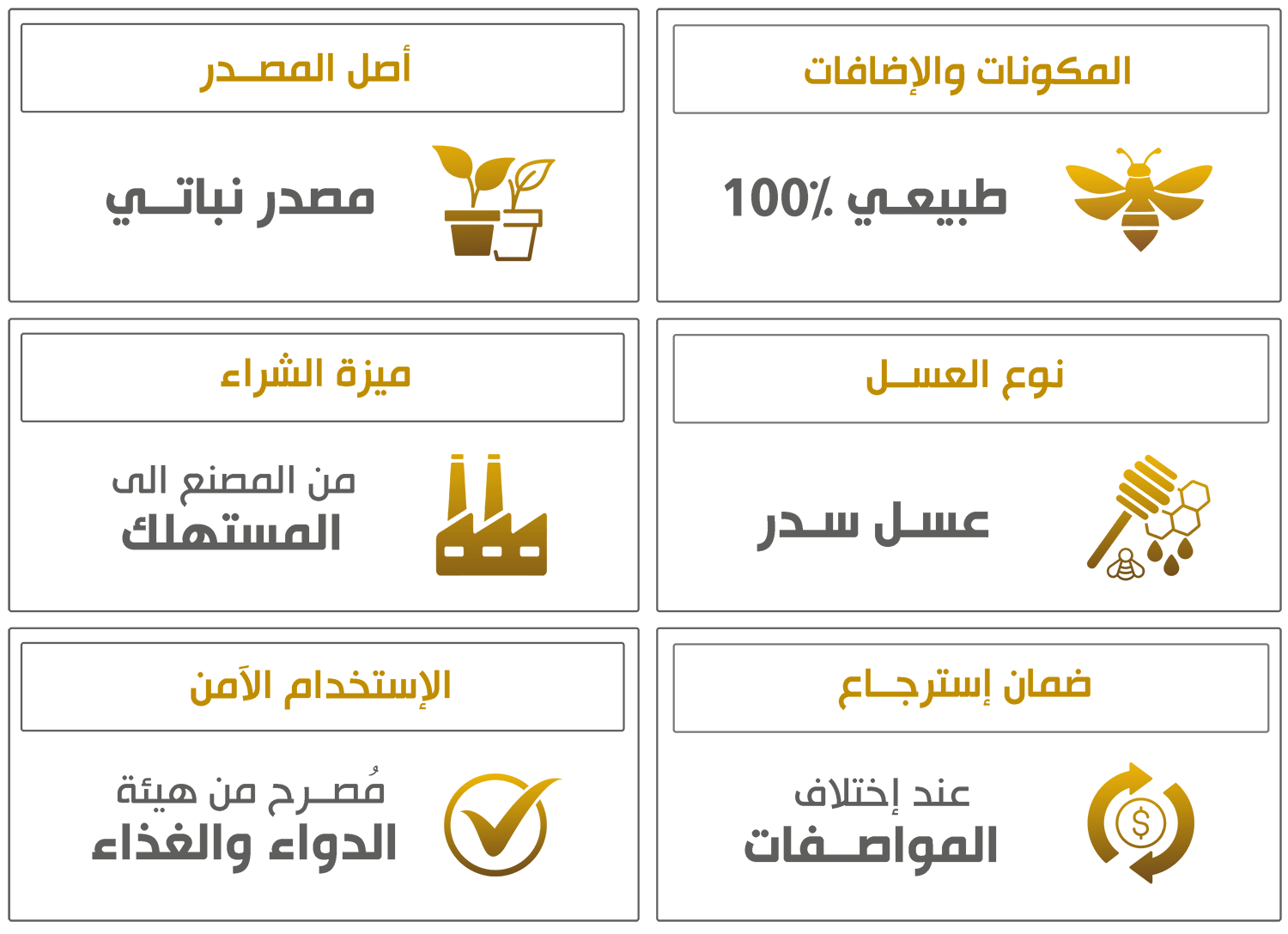 - تغليف مصمم بعناية ليحافظ على النكهة الأصلية وجودة العسل لفترة أطول.